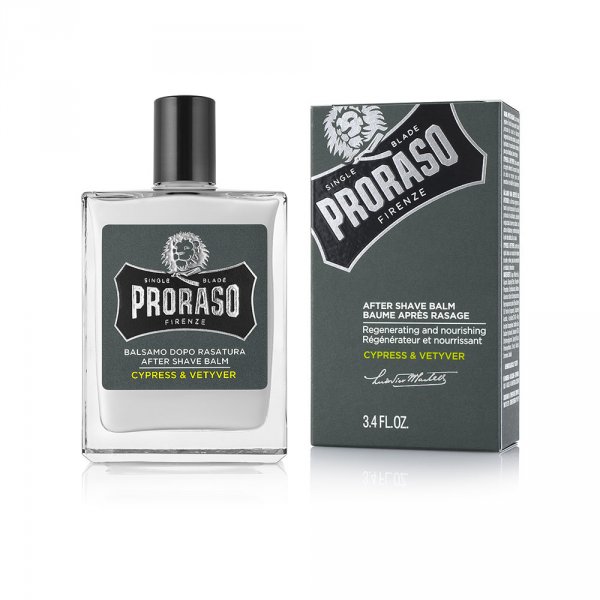 Baume après rasage Proraso Cypres & Vetiver une lotion dans un flacon en verre 100ml.
