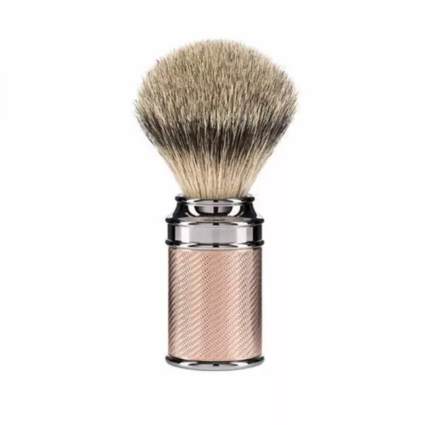 Sa poignée en métal doré rose avec inserts chromés apporte une touche très élégante à ce blaireau de rasage.