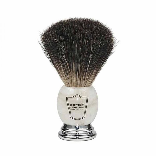 Blaireau de rasage Parker, un accessoire aux fibres synthétiques reconnues pour leur robustesse et nécessitant moins de savon que des fibres naturelles.