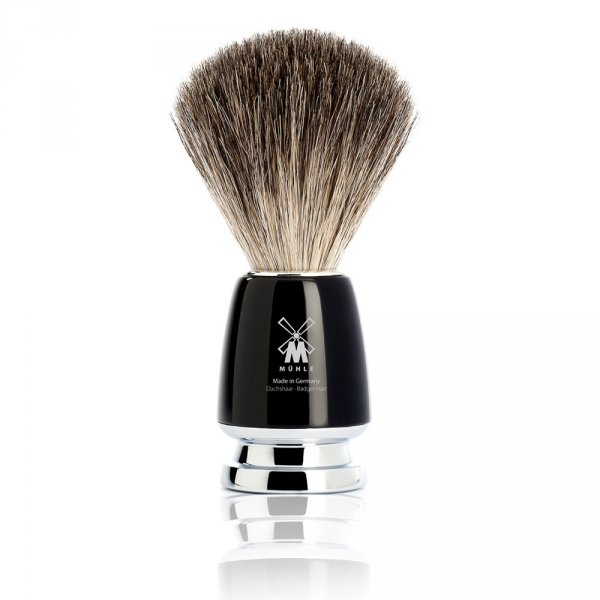 - le poil "Pure Badger" (pur noir) est probablment le type de poil le plus commun. Ce poil est issu du dos du blaireau qui couvre environ 60% de son corps. Le blaireau en poil pur noir ou pure Badger possède généralement un poil court et relativement épais, sa douceur est donc variable selon la provenance du poil. De couleur foncée, le poil pur noir peut présenter divers nuances du clair au noir en passant par le gris. Le poil Pure Badger est un poil ferme, résistant qui absorbe l'eau. Généralement ce type de poil est recommandé aux hommes qui disposent d'une barbe normale à drue grâce à ses propriétés massantes. Le blaireau de rasage Muhle Fred Rytmo possède des poils purs noirs.
