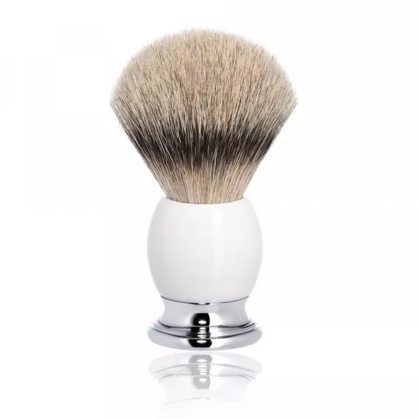 L’ensemble porcelaine-chrome confère une longévité important à ce blaireau rasage Muhle.