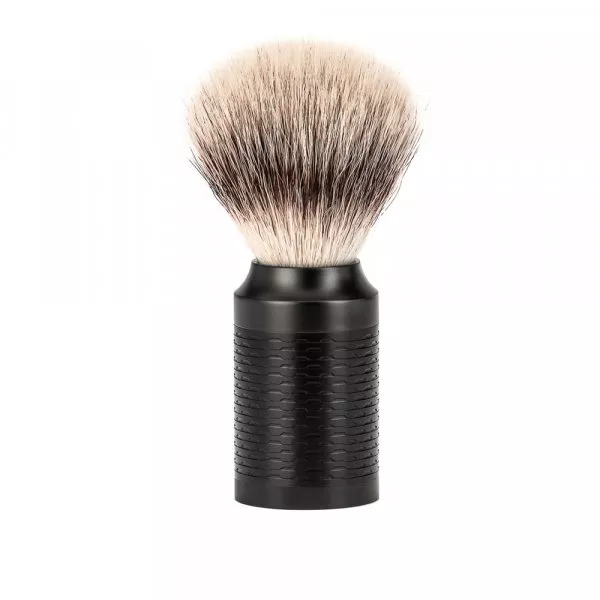 - le poil "Silvertip Badger" (pur argenté) est un grand classique de la gamme des blaireaux de rasage aux poils naturels: Le poil de blaireau à pointe argentée est particulièrement doux et flexible et exclusivement traité à la main dans les ateliers Mühle. Ce poil naturel possède des caractéristiques uniques : son éclatante couleur argentée ainsi que le trait noir sur chacun de ses poils que les connaisseurs qualifient de “miroir” grâce à son effet visuel particulier. Son poil fin, court et conique absorbe beaucoup d’eau et permet de battre une mousse épaisse et crémeuse.