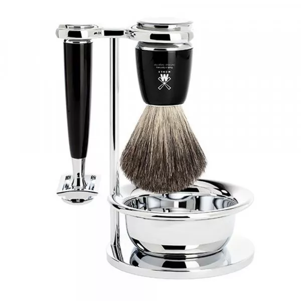 La marque allemande propose différents coffrets de rasage dans lesquels vous pouvez retrouvez : rasoir, blaireau de rasage et support. Certains coffrets intègrent même un bol à raser pour faire monter une mousse abondante à l'aide de votre blaireau de rasage. Le coffret de rasage homme Muhle Rytmo en bois de frêne est sans doute celui qui rencontre le plus de succès.
