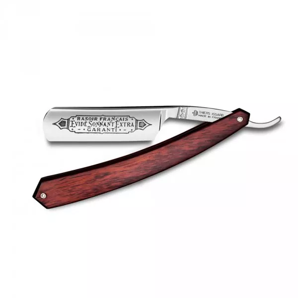 La gravure sur la face avant représente « Rasoir Français Evidé Sonnant Extra Garanti ».