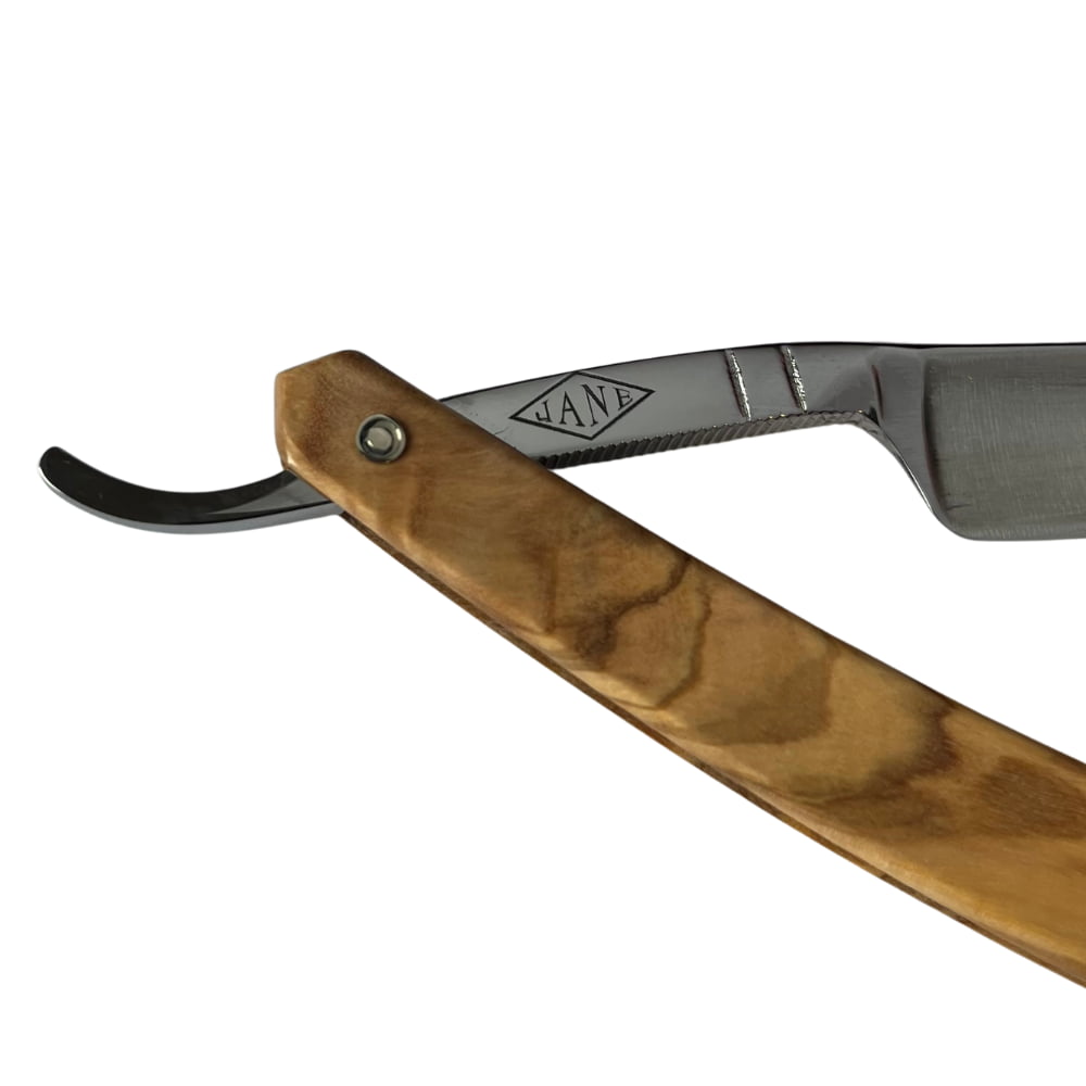 Le manche en bois d'olivier ajoute une touche d'élégance naturelle à ce coupe-chou, tandis que le dos droit et le nez rond confèrent une sensation de maniabilité et de contrôle lors de chaque rasage.