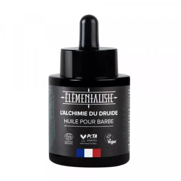 L'huile à barbe Elémentaliste en flacon pipette de 30ml, un soin Made in France élaboré avec 100 % d’ingrédients d’origine naturelle dont 97 % sont issus de l’Agriculture Biologique !