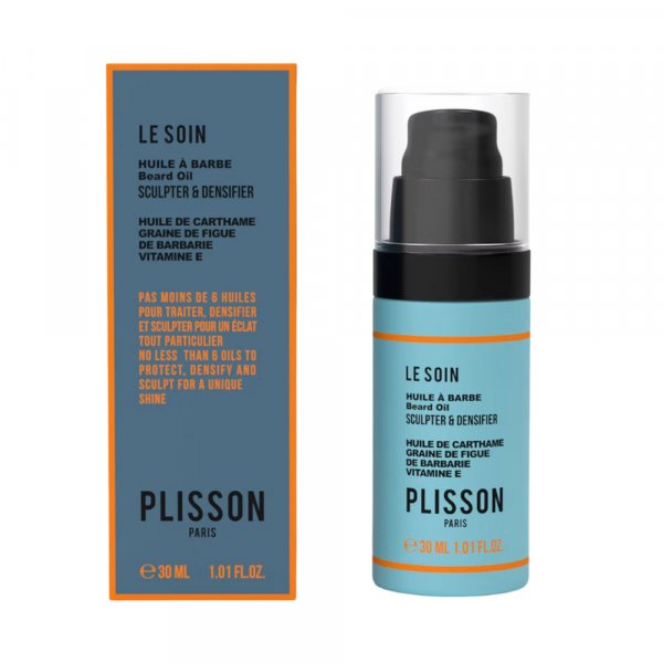 Fabriquée en France, cette huile à barbe Plisson est conditionnée dans un flacon pompe en verre de 30ml.