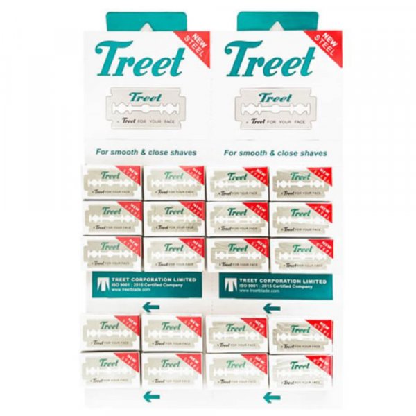 Pour le rasage, Treet propose une grande sélection de lames de rasoir à double tranchant qui s'adapteront parfaitement à tous les rasoirs de sûreté et rasoirs shavette : les lames de rasoir Treet 7 days Platinum, les lames de rasoir Treet Classic, les lames de rasoir Treet Dura Sharp, les lames de rasoir Treet Falcon, les lames de rasoir Treet King, les lames de rasoir Treet New Edge, les lames de rasoir Treet New Steel, les lames de rasoir Treet Power, les lames de rasoir Treet Tez, les lames de rasoir Treet Tjax, les lames de rasoir Treet TPS, les lames de rasoir Treet TRBC, les lames de rasoir Treet Silver, les lames de rasoir Treet Trig et les lames de rasoir Treet Trim. Pour les shavettes, la marque propose les demi lames de rasoir Facon Half Blade.