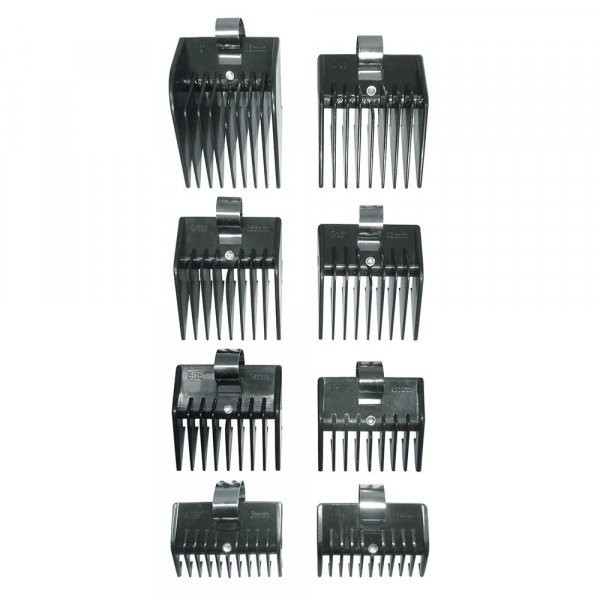 Ces contre-peignes sont vendus par 8 pour raser à différentes hauteurs : 1 mm, 3 mm, 6 mm, 9 mm, 12 mm, 15 mm, 18 mm et 25 mm.
