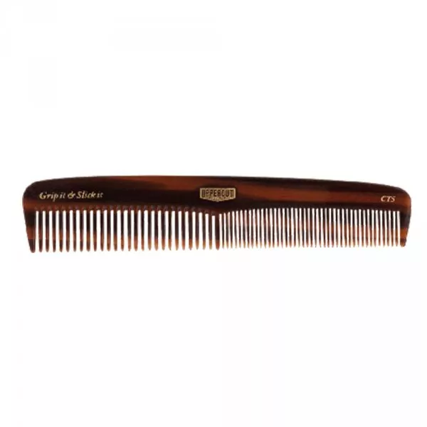 Grâce à ses deux différentes largeurs de dents, le peigne à barbe Uppercut Deluxe CT5-Pocket Comb s’adapte facilement aux poils longs comme courts.