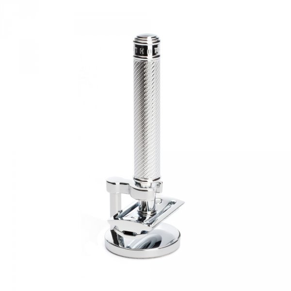 Rasoir de sureté Muhle R89 avec son support en acier chromé brillant.