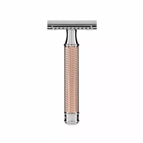 Ce rasoir de sureté Muhle appartenant à la gamme « TRADITIONAL » est fabriqué à partir de métal chromé doré rose.
