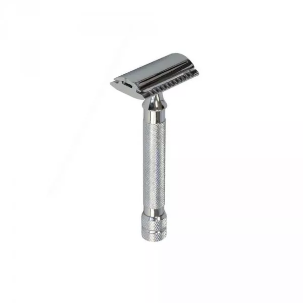 Rasoir de sureté Parker 91R en acier inoxydable argenté avec un grip anti-glisse parfait pour une utilisation quotidienne en toute simplicité.