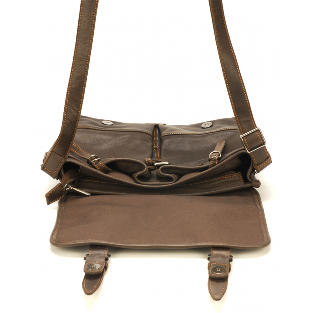 Le sac bandoulière homme reporter cuir Johany est en cuir de vachette couleur châtain aux surpiqûres soignées avec une doublure en coton.