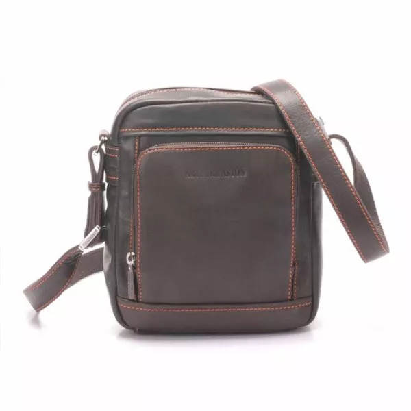 Sacoche homme Arthur & Aston Pablo en cuir de vachette "plongé" colori châtaigne fil orange et doublure polyester.