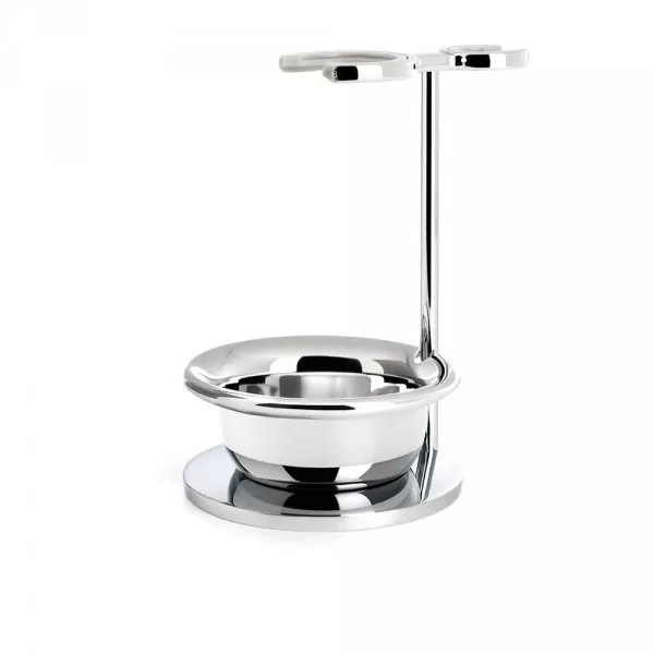 Support blaireau rasage Muhle avec son bol en métal chromé.
