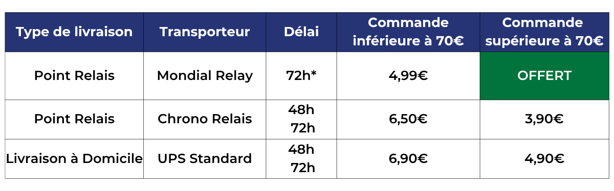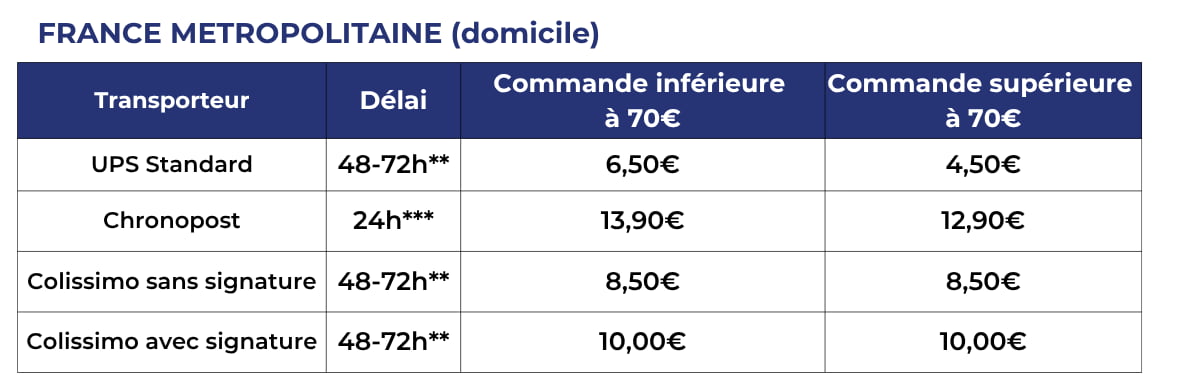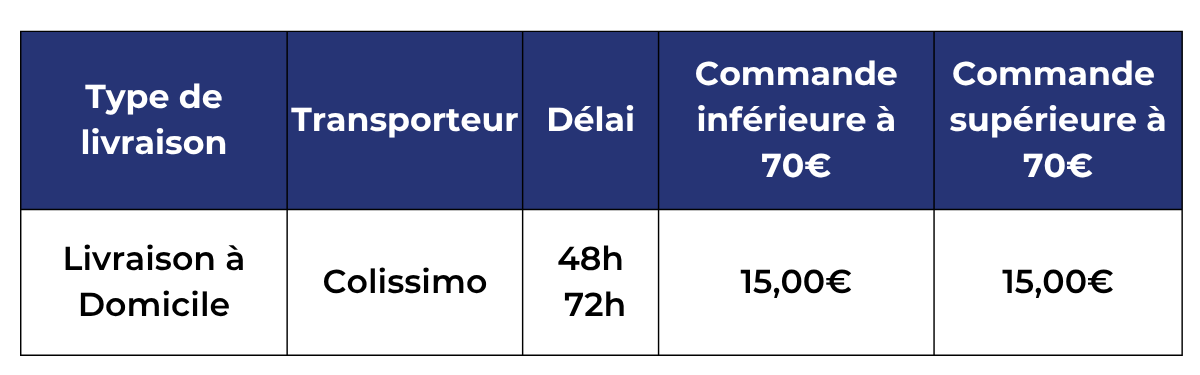 Livraison sous 24h (sous réserve de la disponibilité des produits en stock) en France pour toute commande passée sur le site avant 15h (Ne livre pas le samedi et dimanche, ni les jours fériés).