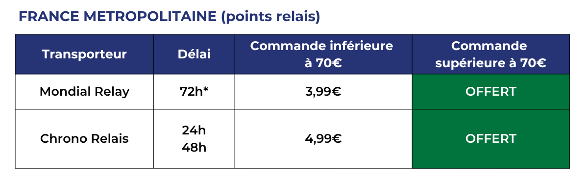 Le colis est déposé dans un point relais de votre choix (Mondial Relay ou Chrono Relais). Vous pourrez accéder aux informations pratiques (lieu et horaires d'ouverture) lors de la validation de votre commande. Vous pourrez ensuite le retirer en fonction des horaires du point relais.